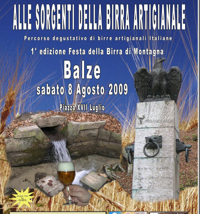 Leonardo Moretti ci segnala la seguente iniziativa. Festa della Birra Artigianale a Balze di Verghereto (FC) il giorno 8 agosto 2009. ore 16:00 apertura stand e inizio cotta pubblica ore 17:00 degustazione guidata ore 21:00 degustazione guidata ore 21:30 inizio concerti con musica fino a tarda sera continua la serata ad oltranza!!!! ...finchè c'è birra si fa festa tutte le info su www.prolocobalze.com/birra Fonte Comunicato Stampa Giugno 2009 |